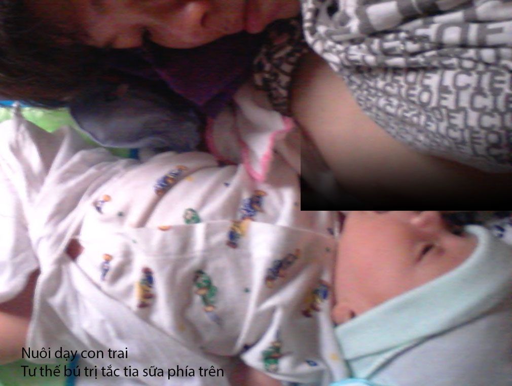 Khi bé bú thì lưỡi của bé đóng vai trò quan trọng, làm điểm tựa để bé mút được mạnh hơn, do đó mình cảm nhận rõ là những tia sữa ở vị trí môi dưới của bé sẽ được hút nhiều hơn những tia khác. Vì vậy khi bị tắc tia sữa, mình tranh thủ khi bé đói, tiến hành chỉnh tư thế cho con bú để làm sao lưỡi và môi dưới của bé nằm đúng vị trí tia sữa bị tắc. Mẹ có thể cho bé nằm ngửa và mẹ xoay người chống tay chân xuống giường để đến đúng vị trí mong muốn. Hoặc mẹ nhờ người nhà bế bé để mẹ xoay nếu bé ko hợp tác.